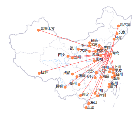 江蘇、浙江線:青島-南京 青島-無錫 青島—蘇州 青島—南通 青島—杭州 青島—寧波 青島—溫州 青島—金華 青島—余姚